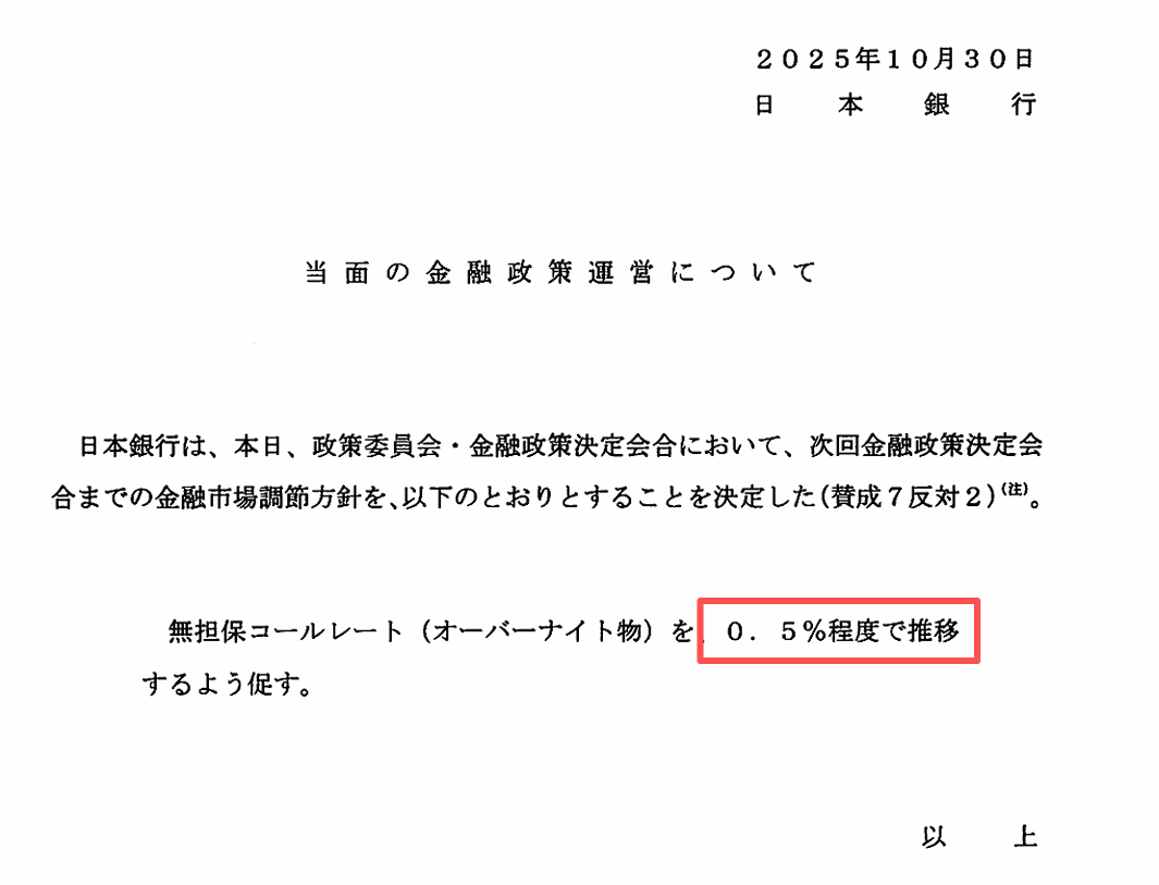 10月30日,日本央行宣布维持基准利率在0.5%不变,为连续第六次“按兵不动”,符合市场预期。