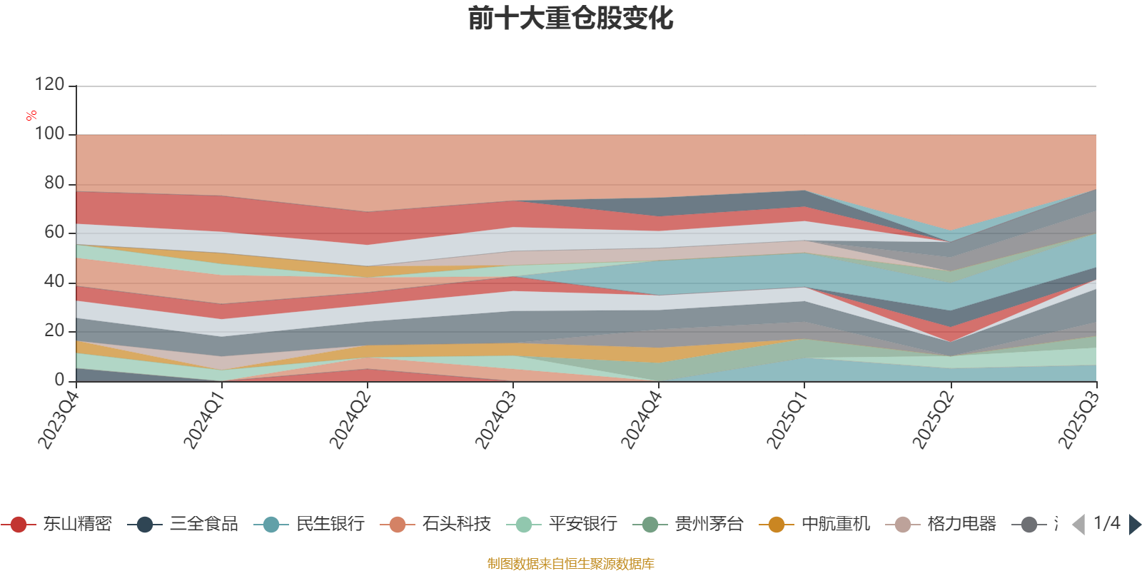 该基金持股集中度较高,近2年前十大重仓股集中度长期超过60%。截至2025年三季度末,基金十大重仓股分别是光大银行、东方财富、北京银行、中国太保、平安银行、民生银行、浙商证券、顺丰控股、贵州茅台、万华化学。