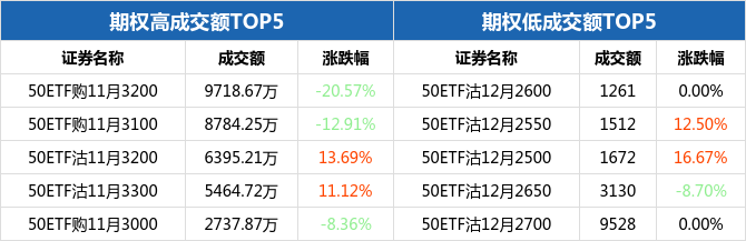 从成交额来看,50ETF期权合约中,50ETF购11月3200成交额最高,为9718.67万元,全日下跌20.57%,报收0.0475元;而最低的为50ETF沽12月2600,成交额为1261元,全日收平,报收0.0019元。