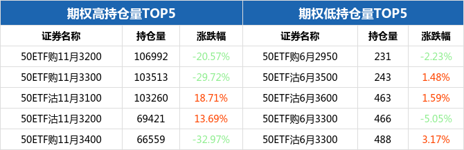 从持仓量来看,50ETF期权合约中,50ETF购11月3200持仓量最大,为106992张,期权全日下跌20.57%,报收0.0475元;持仓量最小的为50ETF购6月2950,共计231张,期权全日下跌2.23%,报收0.3468元。