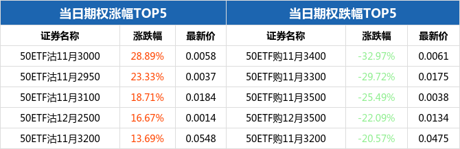 上证上证50ETF收跌,50ETF沽11月3000涨幅28.89%
