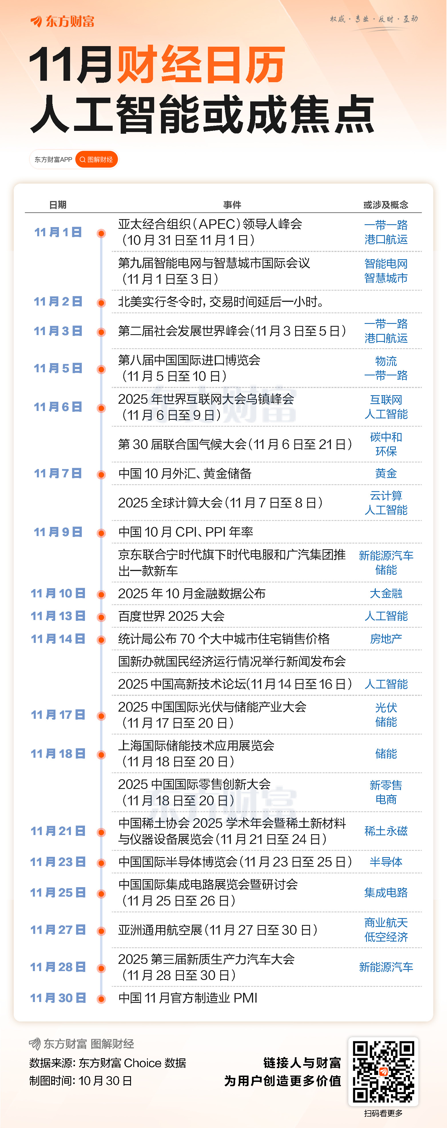 展望11月,进博会、联合国气候大会、世界互联网大会、2025全球计算大会等多项会议活动将陆续举行,一系列经济数据的发布也值得关注。