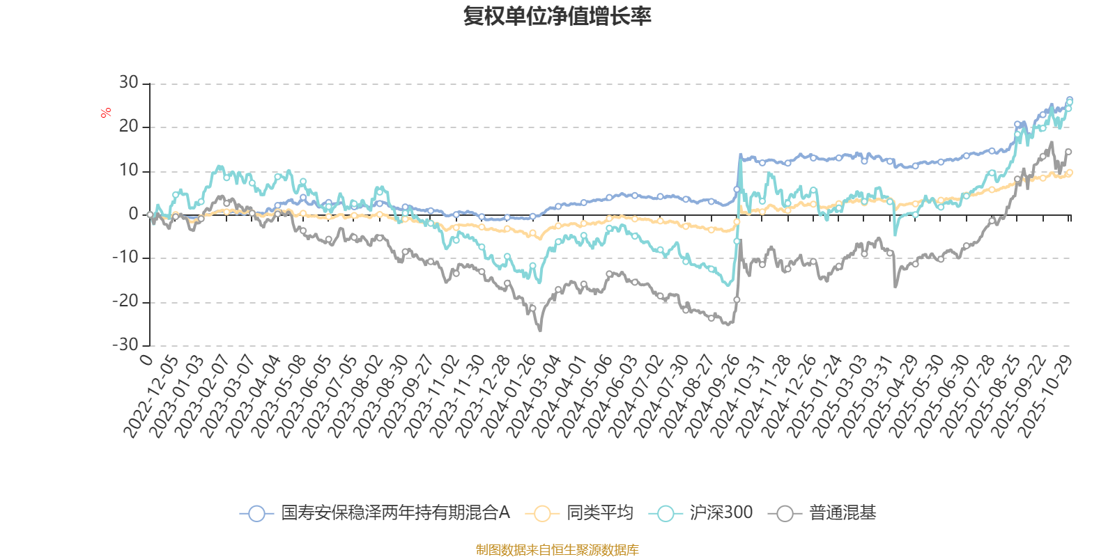 截至10月29日,国寿安保稳泽两年持有期混合A近三个月复权单位净值增长率为10.26%,位于同类可比基金21/629;近半年复权单位净值增长率为13.66%,位于同类可比基金51/629;近一年复权单位净值增长率为12.78%,位于同类可比基金84/623。