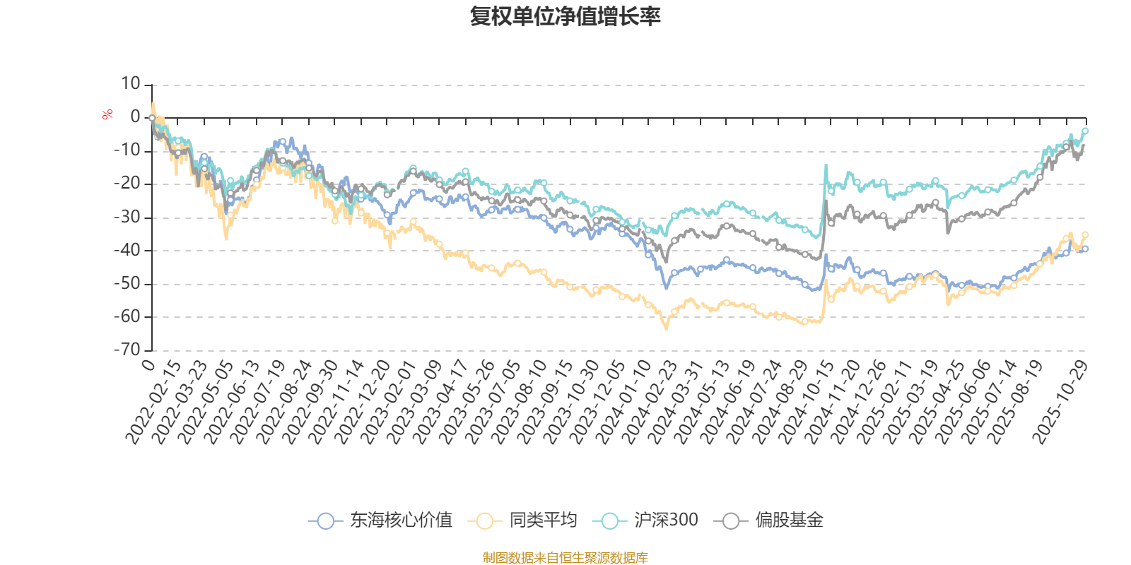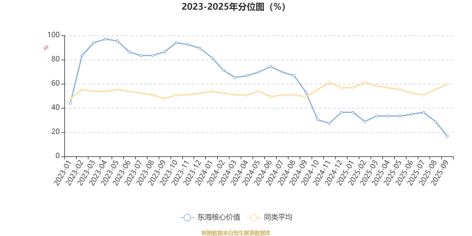 截至10月29日,东海核心价值近三个月复权单位净值增长率为9.76%,位于同类可比基金82/100;近半年复权单位净值增长率为22.16%,位于同类可比基金88/99;近一年复权单位净值增长率为9.44%,位于同类可比基金80/90;近三年复权单位净值增长率为-21.99%,位于同类可比基金51/62。