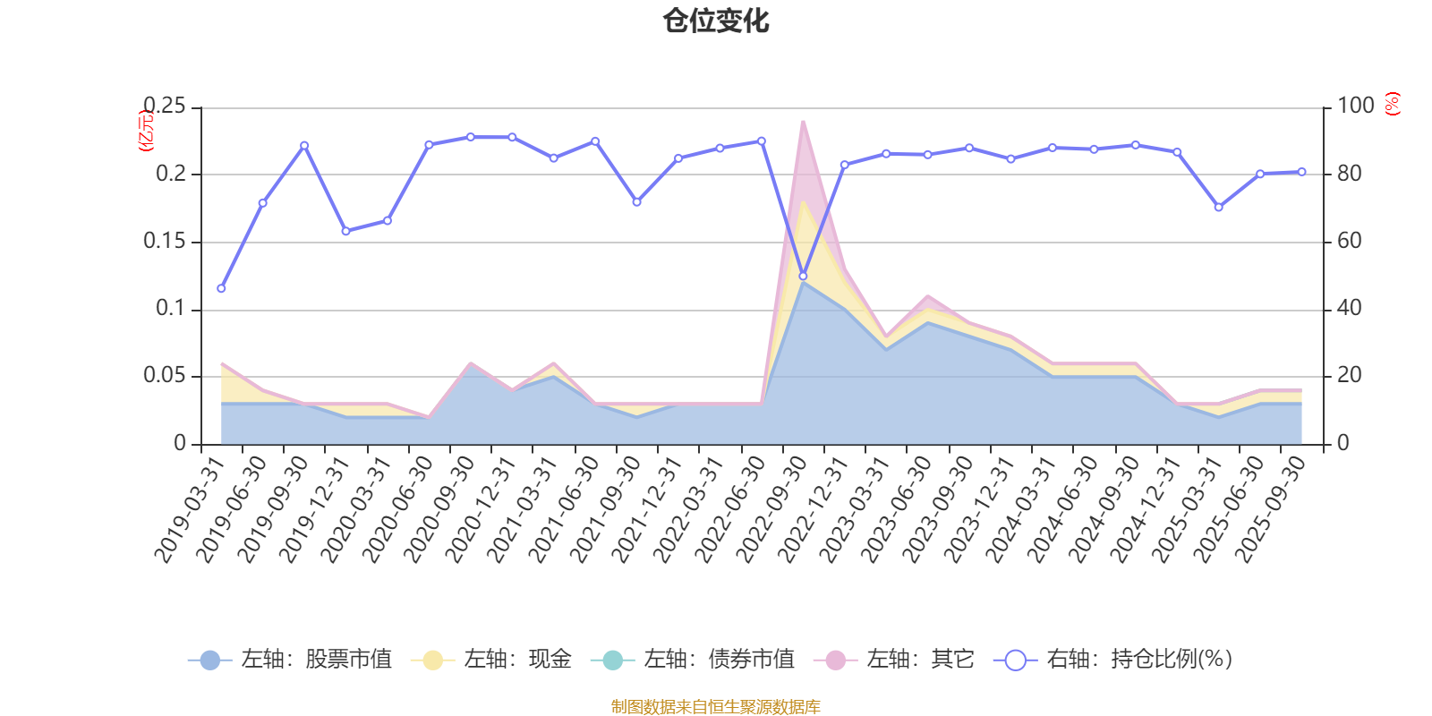 据定期报告数据统计,近三年平均股票仓位为84.22%,同类平均为87.09%。2020年三季度末基金达到91.23%的最高仓位,2019年一季度末最低,为46.29%。
