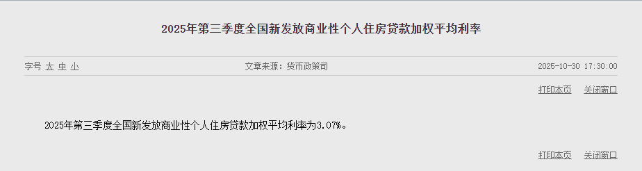 上证报中国证券网讯中国人民银行30日发布数据,2025年第三季度全国新发放商业性个人住房贷款加权平均利率为3.07%。