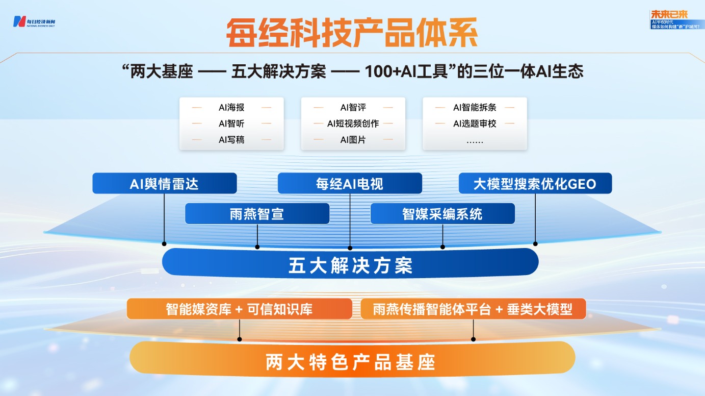 闻达总结道,媒体转型的核心是实现“人的智能化”,而非“机器换人”。每经科技(每日经济新闻旗下的科技平台)作为这一理念的技术基石,通过自研的五大传播解决方案产品和两大特色基座产品,全面重塑了传播的各个环节,让专业媒体人如虎添翼。