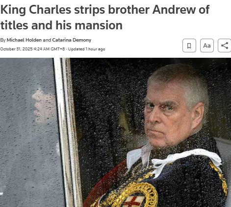 中新网10月31日电据路透社及美国《纽约时报》等外媒报道,当地时间10月30日,英国白金汉宫表示,英国国王查尔斯三世已启动正式程序,剥夺其弟安德鲁王子的尊号、头衔及荣誉,并已通知他搬离王室住所。