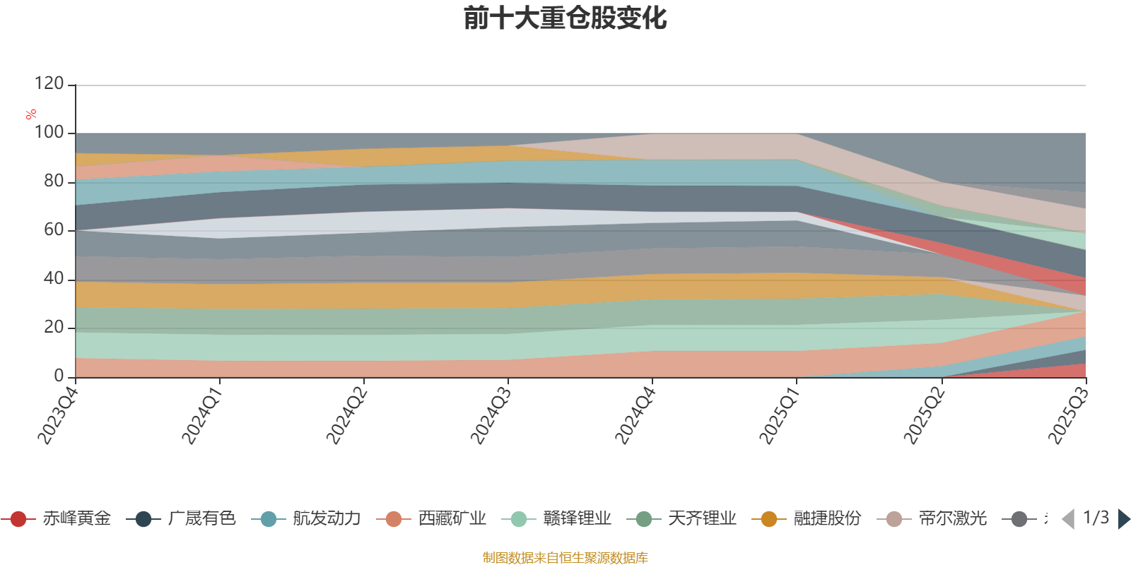 该基金持股集中度较高,近2年前十大重仓股集中度长期超过60%。截至2025年三季度末,基金十大重仓股分别是中矿资源、西藏矿业、雅化集团、奕瑞科技、华钰矿业、盐湖股份、帝尔激光、赤峰黄金、广晟有色、航发动力。