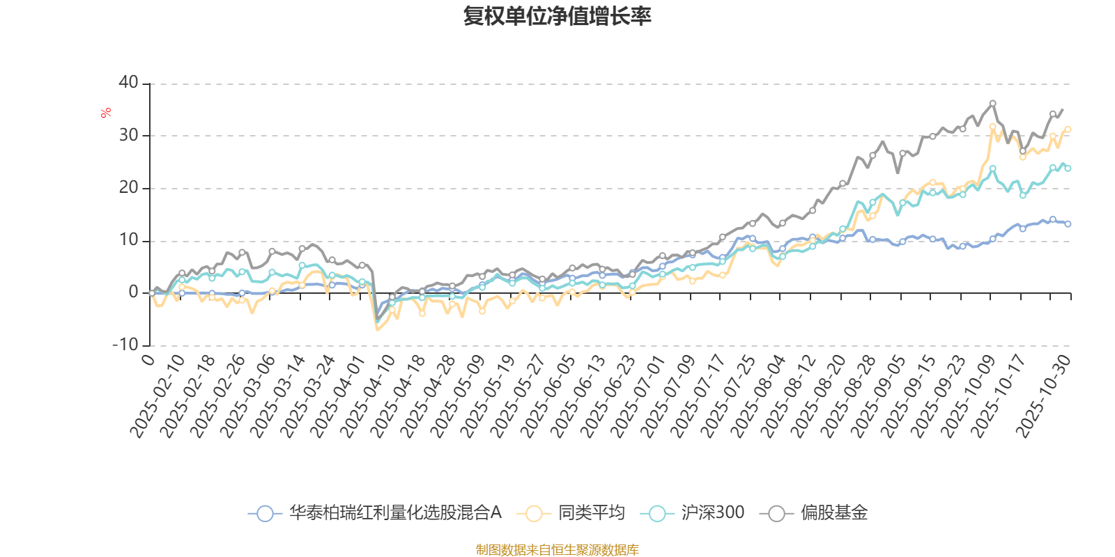 截至10月30日,华泰柏瑞红利量化选股混合A近三个月复权单位净值增长率为3.06%,位于同类可比基金47/49;近半年复权单位净值增长率为13.23%,位于同类可比基金44/49。
