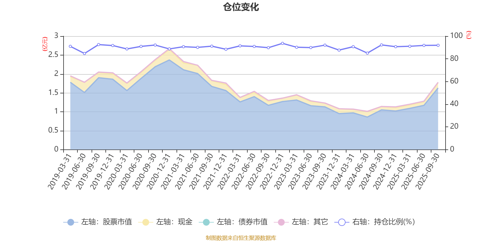据定期报告数据统计,近三年平均股票仓位为90.6%,同类平均为85.66%。2022年末基金达到93.66%的最高仓位,2019年上半年末最低,为84.71%。