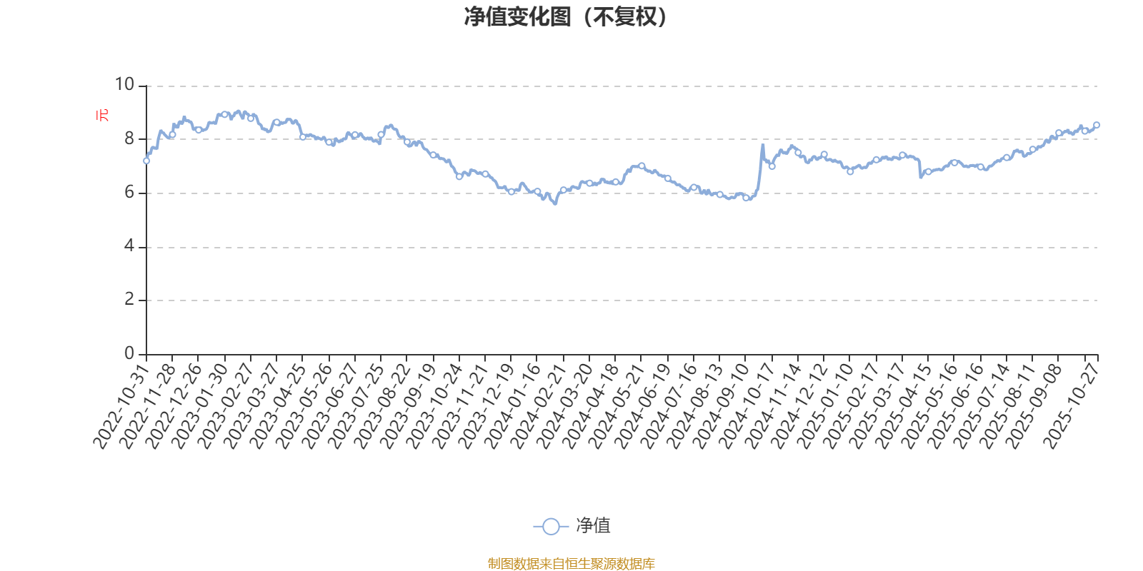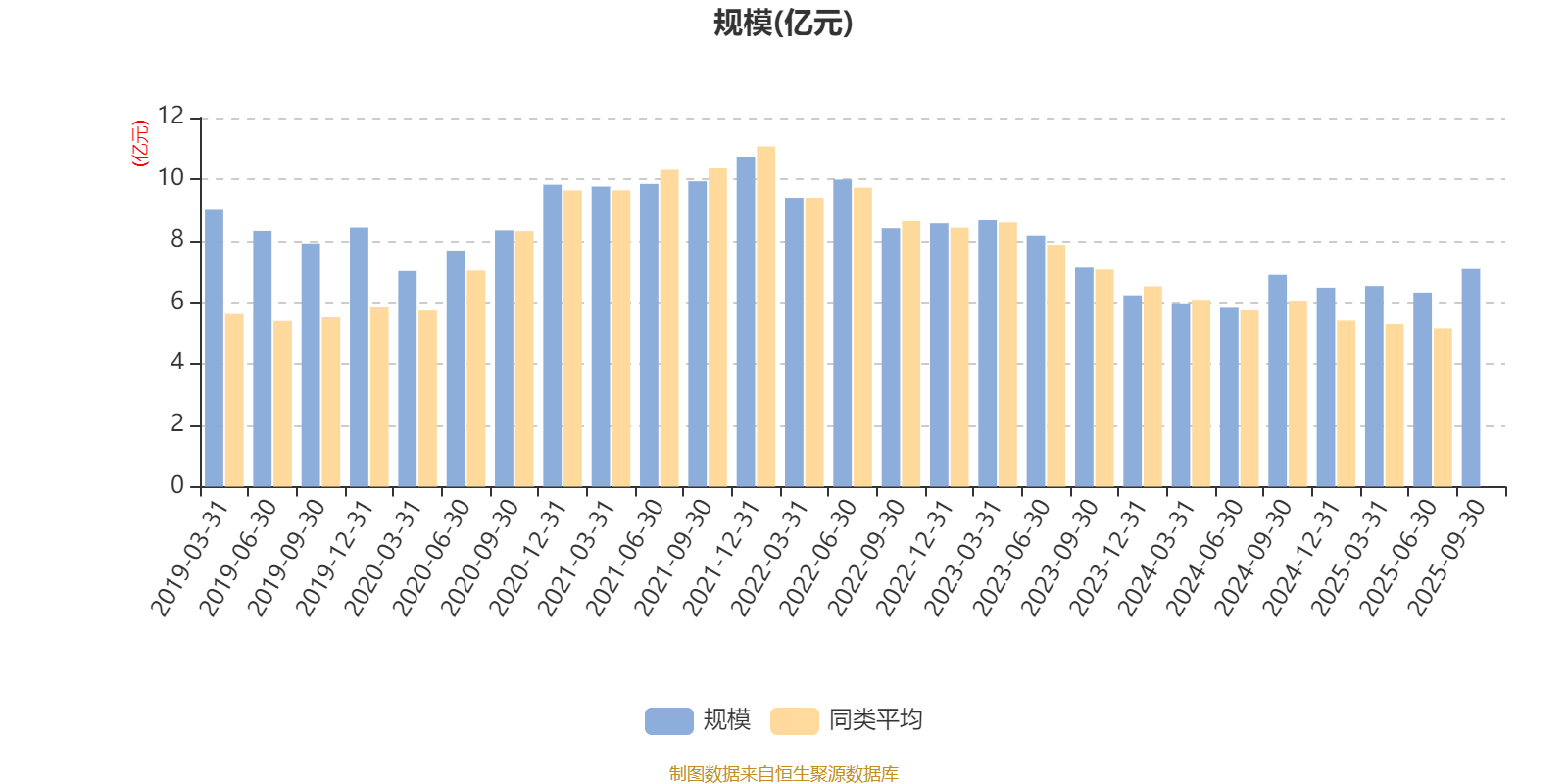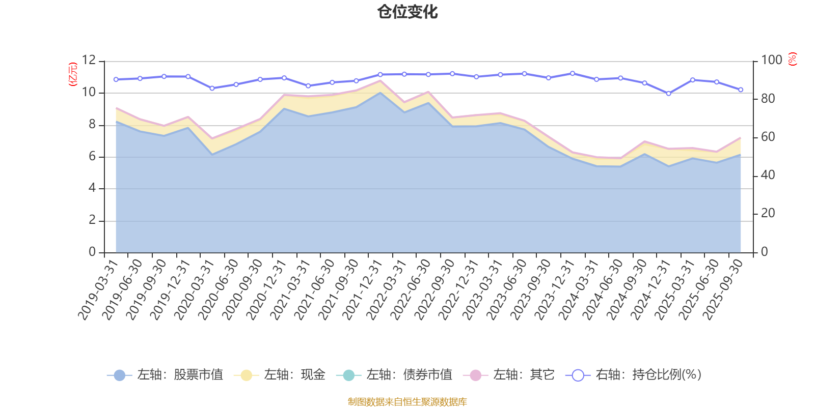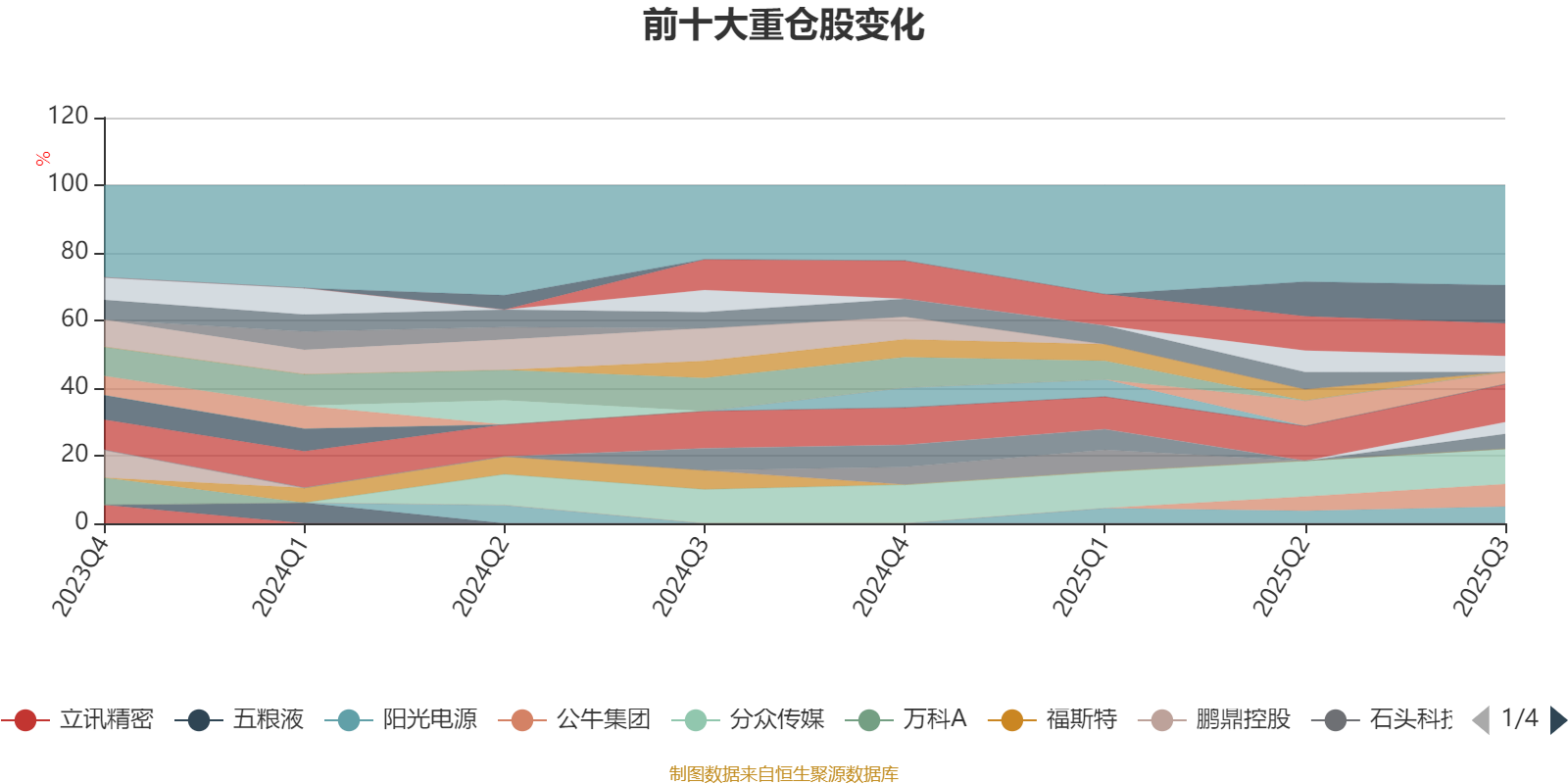 该基金持股集中度较高,近2年前十大重仓股集中度长期超过60%。截至2025年三季度末,基金十大重仓股分别是盐湖股份、宁德时代、分众传媒、京东方A、公牛集团、阳光电源、云铝股份、贵州茅台、神火股份、海康威视。