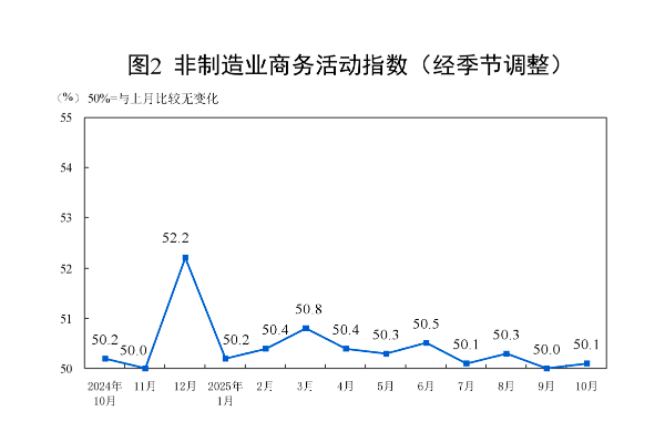 非制造业方面,10月份非制造业商务活动指数为50.1%,比上月上升0.1个百分点,升至扩张区间。