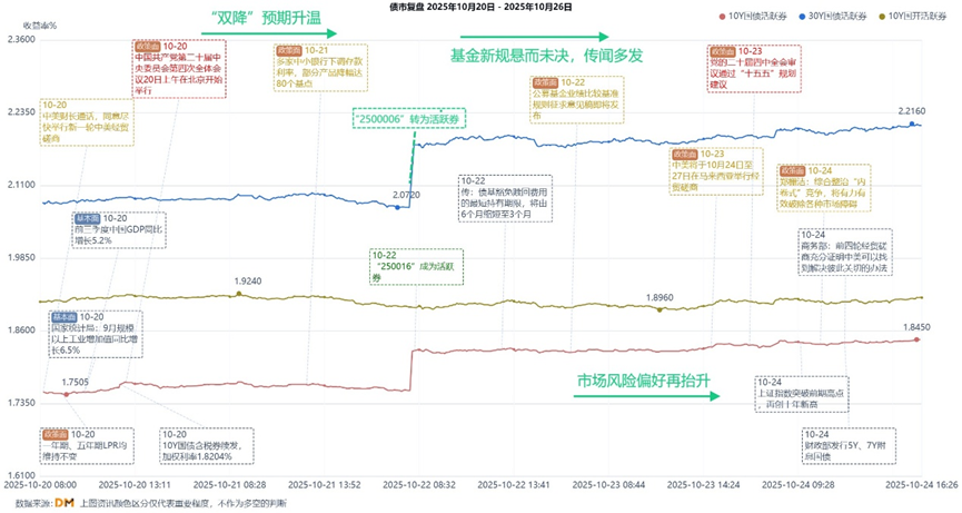 (数据来源:WIND资讯,平安基金整理,截至20251024)上周(10月20日-10月24日)债市震荡,主要受中美谈判预期、降准降息预期、基金赎回新规迟迟未能落地和四中全会政策预期四大因素影响,走势较为纠结。具体而言,周一债市再度转跌;周二整体维持震荡态势,尾盘意外走强;周三日内行情平淡,尾盘再度走强,盘中受赎回新规传闻影响较大;周四日内情绪观望,机构博弈四中全会预期;周五情绪偏空,中长债收益率全面上行。全周走势复盘如下图所示。