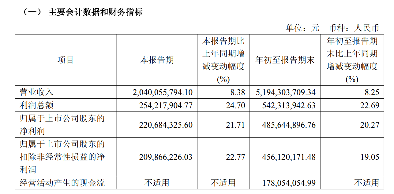 其中,公司第三季度营业收入为20.40亿元,同比上升8.38%;归母净利润为2.21亿元,同比上升21.71%。截至三季度末,公司总资产102.33亿元,较上年度末增长6.42%。