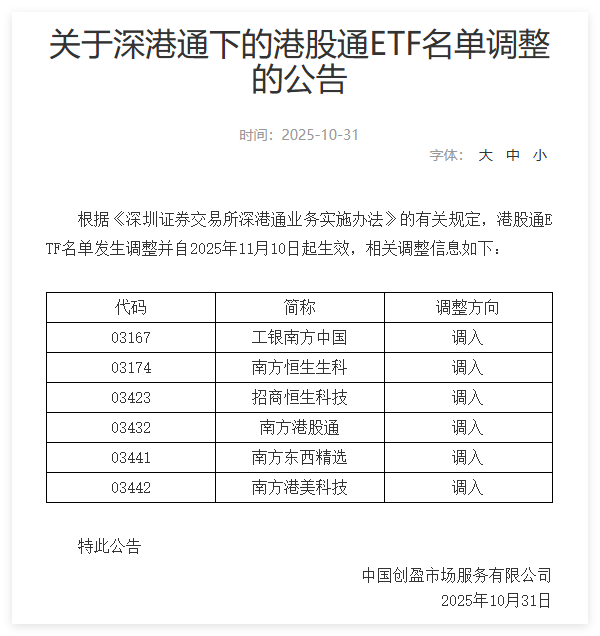 深港通下的港股通ETF名单调整,自2025年11月10日起生效。