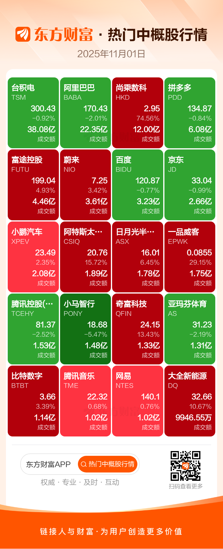 台积电跌0.92%,阿里巴巴跌2.01%,尚乘数科涨74.56%,拼多多跌0.84%,富途控股涨4.93%,蔚来涨3.42%,百度跌0.77%,京东跌0.99%,小鹏汽车涨2.35%,阿特斯太阳能涨15.72%。