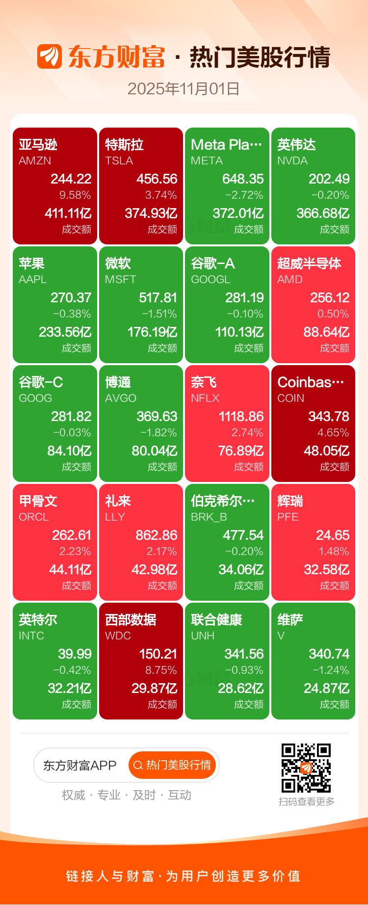 亚马逊涨9.58%,特斯拉涨3.74%,Meta Platforms Inc-A跌2.72%,英伟达跌0.20%,苹果跌0.38%,微软跌1.51%,谷歌-A跌0.10%,超威半导体涨0.50%,谷歌-C跌0.03%,博通跌1.82%。