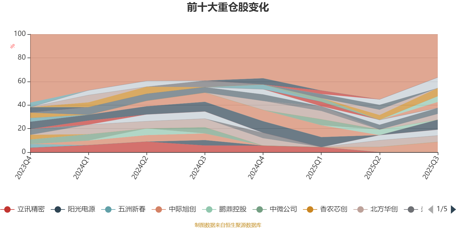 截至2025年三季度末,基金十大重仓股分别是新易盛、中际旭创、寒武纪、工业富联、北方华创、中科曙光、沪电股份、深南电路、中芯国际、胜宏科技。