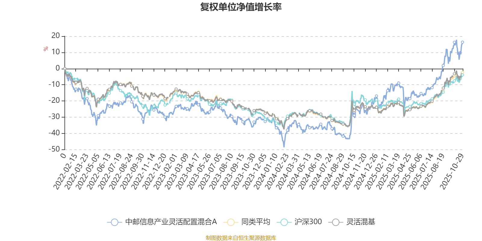 截至10月29日,中邮信息产业灵活配置混合A近三个月复权单位净值增长率为22.86%,位于同类可比基金320/1287;近半年复权单位净值增长率为41.56%,位于同类可比基金276/1287;近一年复权单位净值增长率为57.62%,位于同类可比基金123/1287;近三年复权单位净值增长率为60.75%,位于同类可比基金104/1286。