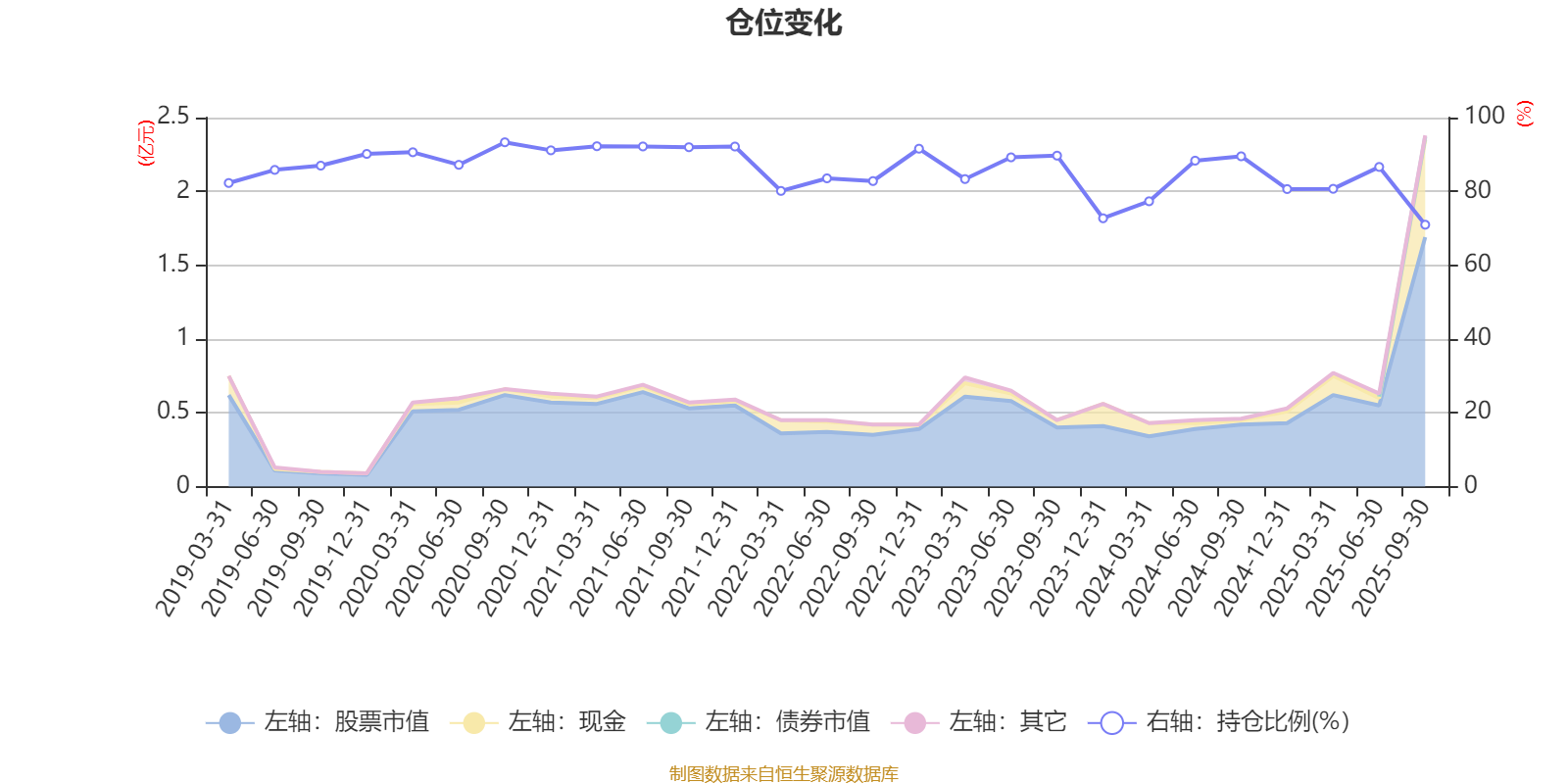 据定期报告数据统计,近三年平均股票仓位为83.39%,同类平均为72.35%。2020年三季度末基金达到93.31%的最高仓位,2025年三季度末最低,为70.97%。