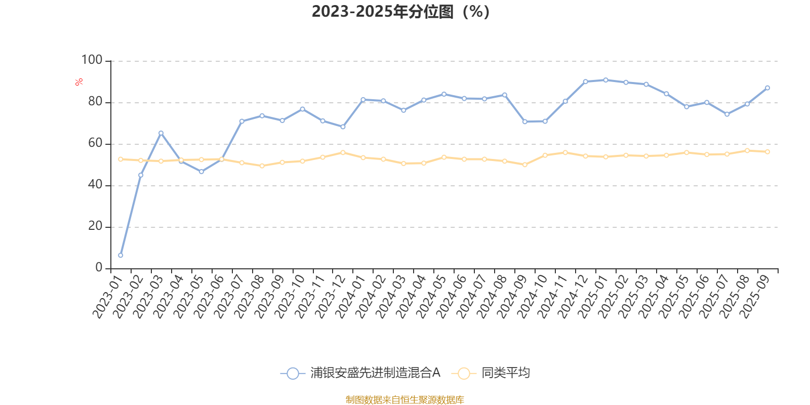 通过所选区间该基金净值增长率分位图,可以观察该基金与同类基金业绩比较情况。图为坐标原点到区间内某时点的净值增长率在同类基金中的分位数。