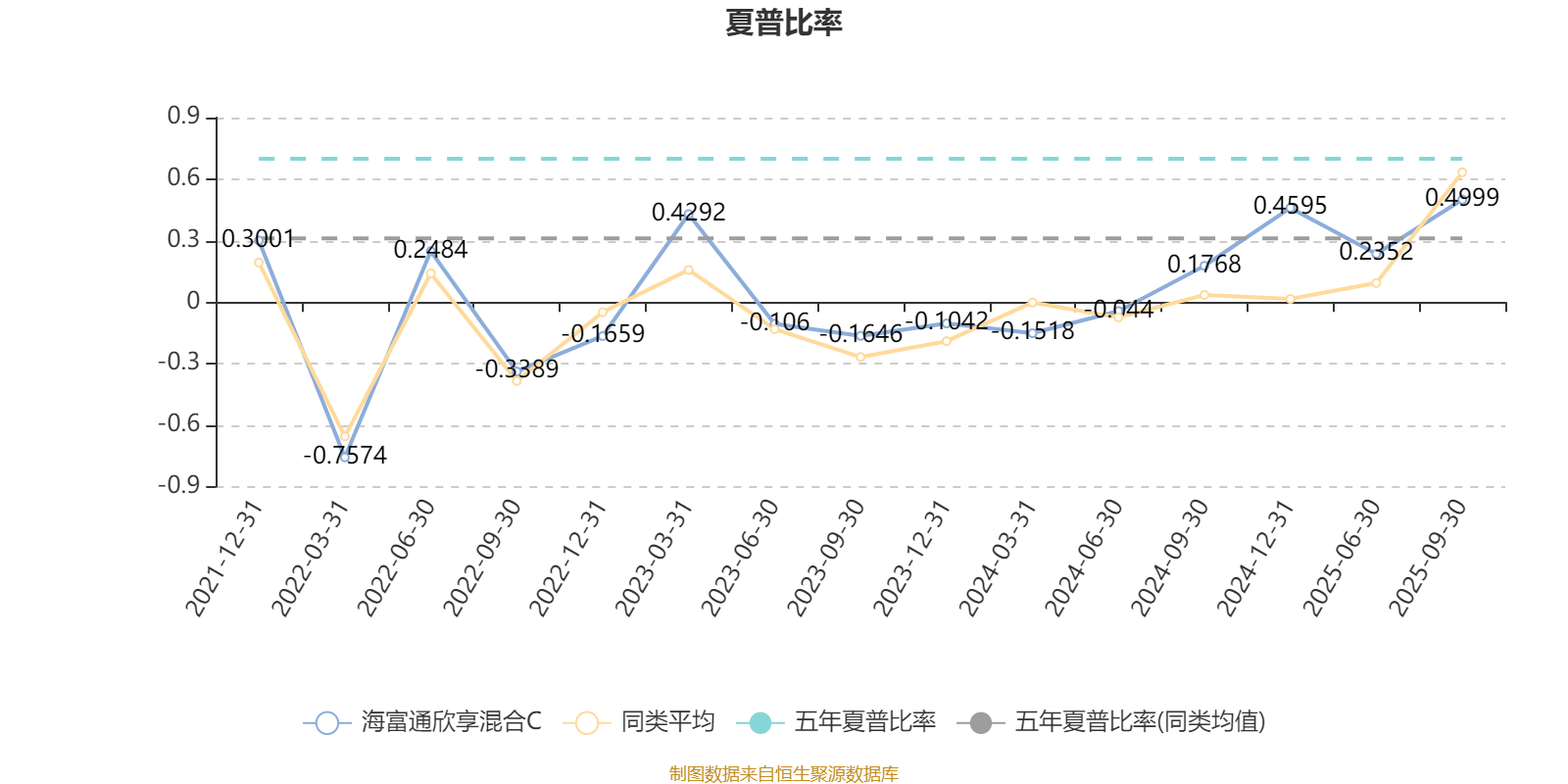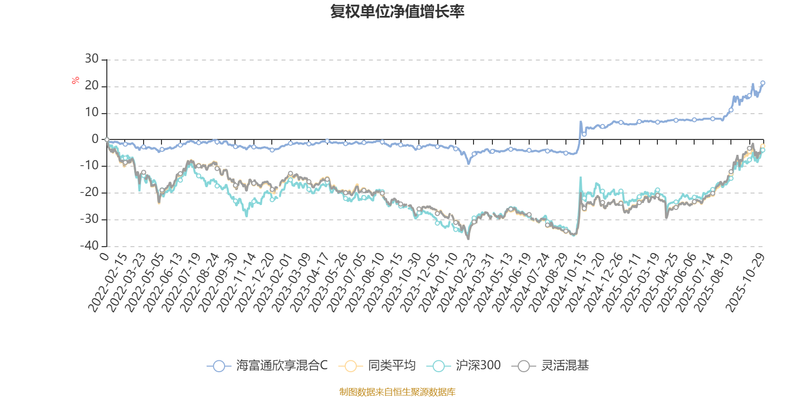 截至10月29日,海富通欣享混合C近三个月复权单位净值增长率为12.42%,位于同类可比基金639/1287;近半年复权单位净值增长率为13.00%,位于同类可比基金973/1287;近一年复权单位净值增长率为16.29%,位于同类可比基金820/1287;近三年复权单位净值增长率为25.79%,位于同类可比基金467/1286。
