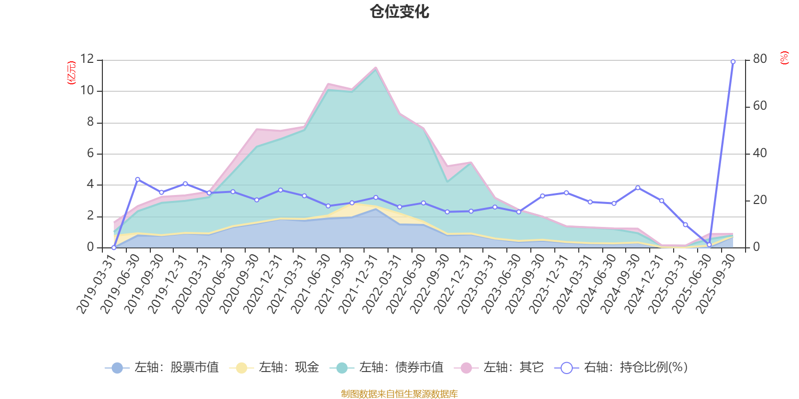 据定期报告数据统计,近三年平均股票仓位为22.29%,同类平均为72.35%。2025年三季度末基金达到79.22%的最高仓位,2025年上半年末最低,为1.25%。