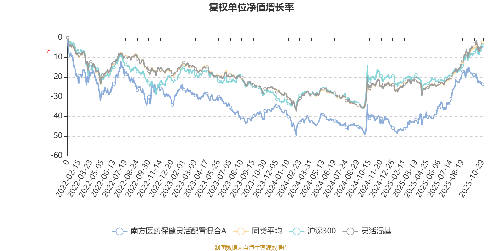 截至10月29日,南方医药保健灵活配置混合A近三个月复权单位净值增长率为-3.24%,位于同类可比基金1255/1287;近半年复权单位净值增长率为28.89%,位于同类可比基金546/1287;近一年复权单位净值增长率为28.32%,位于同类可比基金538/1287;近三年复权单位净值增长率为6.25%,位于同类可比基金911/1286。
