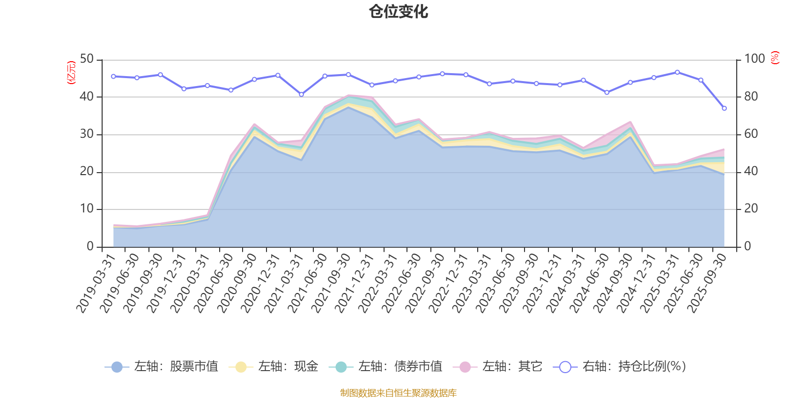 据定期报告数据统计,近三年平均股票仓位为87.33%,同类平均为72.35%。2025年一季度末基金达到93.3%的最高仓位,2025年三季度末最低,为74.05%。