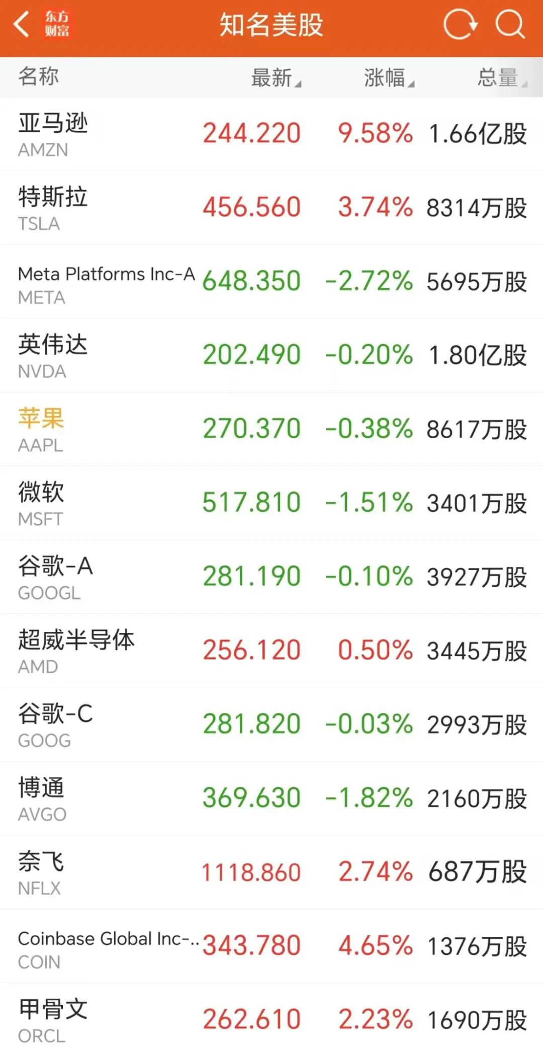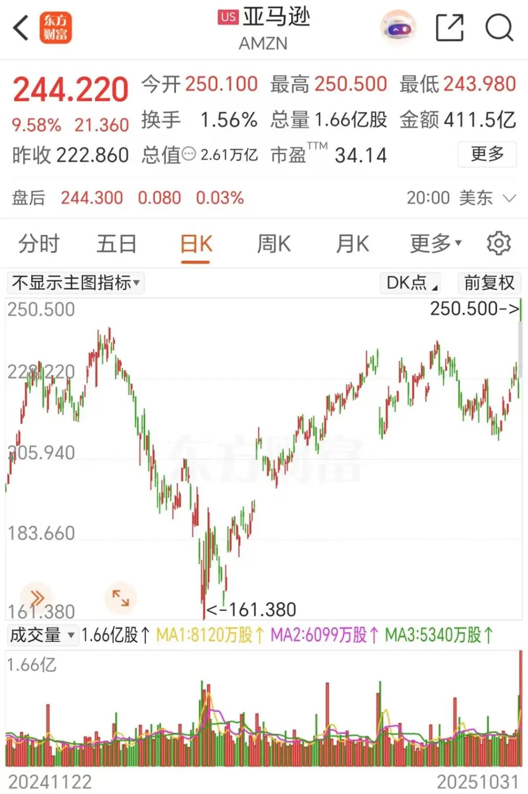 周五美股科技巨头亚马逊开盘涨逾12%,最终收涨超9%,报244.22美元/股,股价创历史新高。