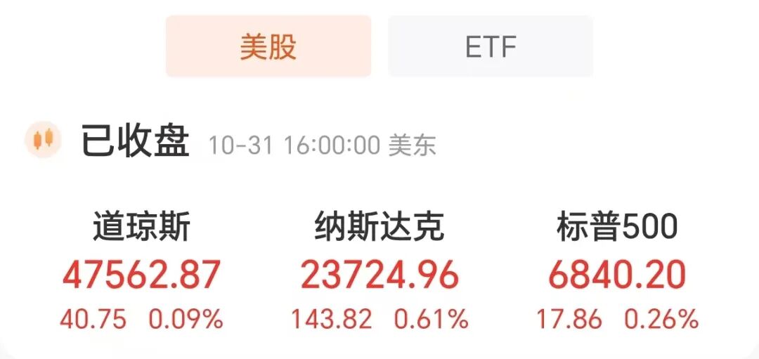 当地时间周五(10月31日),美股三大指数收盘全线上涨。截至收盘,道琼斯工业平均指数比前一交易日上涨40.75点,收于47562.87点,涨幅为0.09%;标准普尔500种股票指数上涨17.86点,收于6840.2点,涨幅为0.26%;纳斯达克综合指数上涨143.82点,收于23724.96点,涨幅为0.61%。10月,道指涨幅2.51%,涨1165点;纳指涨幅4.7%,涨1065点;标普涨幅2.27%,涨152点。纳指月线7连涨,道指、标普月线6连涨。