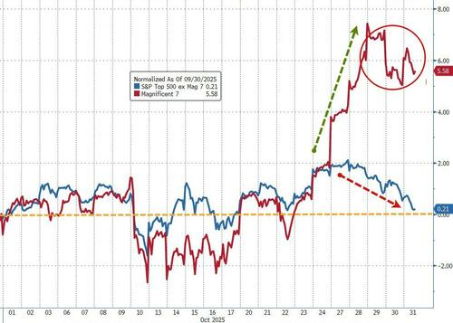 10月31日,高盛交易员Mark Wilson撰文指出,纳斯达克指数连续两月录得5%涨幅,但市场集中度达到历史极端。本周二标普500指数上涨时,上涨股票与下跌股票的比例创下有记录以来最低水平。这意味着美国大型科技股独领风骚,而其他493只成分股几乎原地踏步。