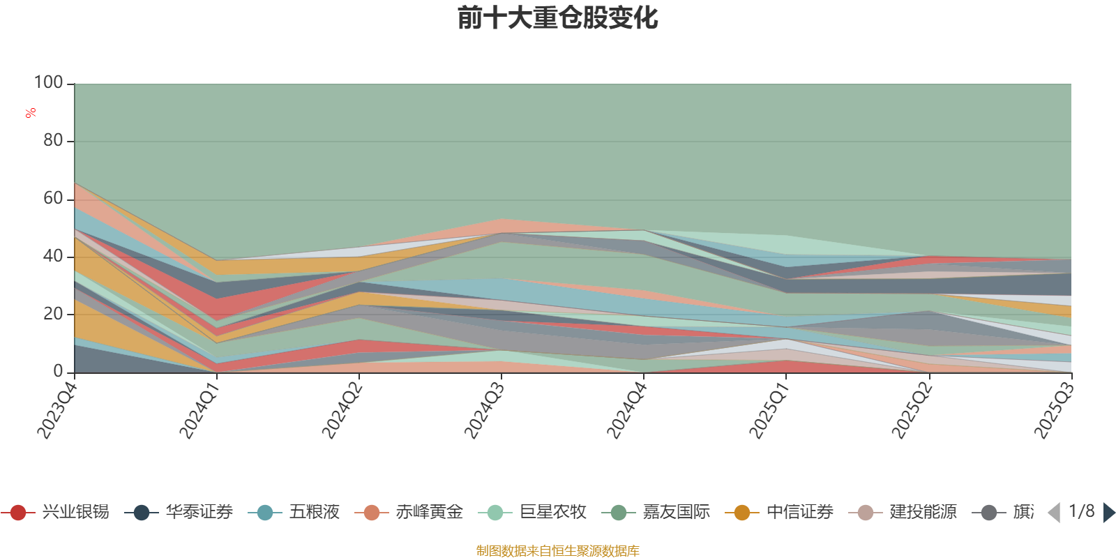截至2025年三季度末,基金十大重仓股分别是瀚蓝环境、九丰能源、齐鲁银行、方大特钢、中国化学、纳思达、南钢股份、大参林、旺能环境、金山办公。