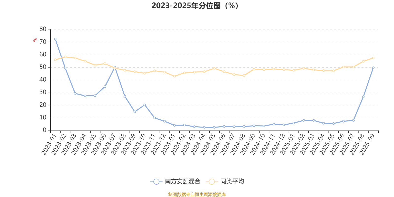 通过所选区间该基金净值增长率分位图,可以观察该基金与同类基金业绩比较情况。图为坐标原点到区间内某时点的净值增长率在同类基金中的分位数。