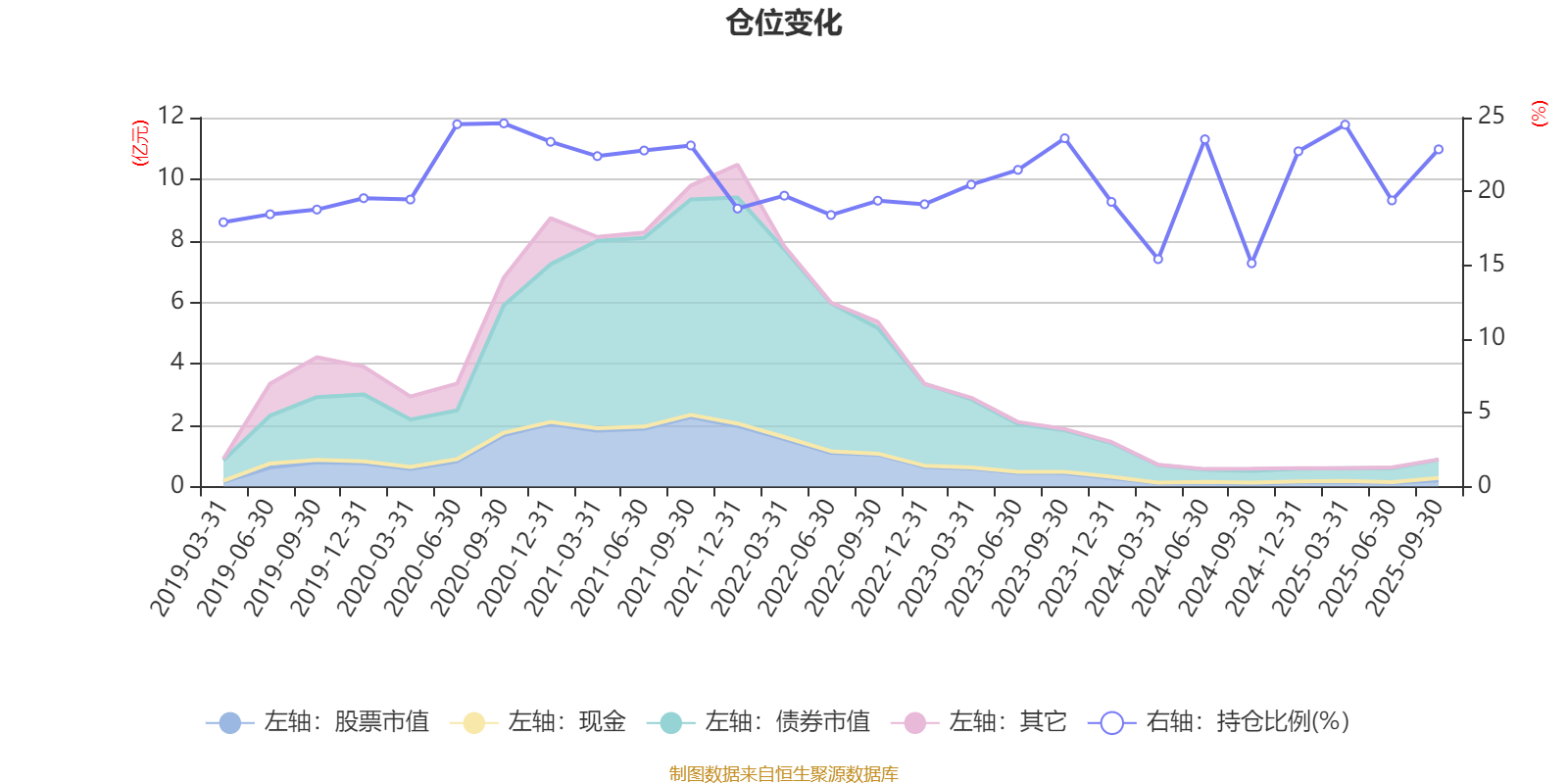 据定期报告数据统计,近三年平均股票仓位为20.62%,同类平均为19.14%。2020年三季度末基金达到24.61%的最高仓位,2024年三季度末最低,为15.13%。