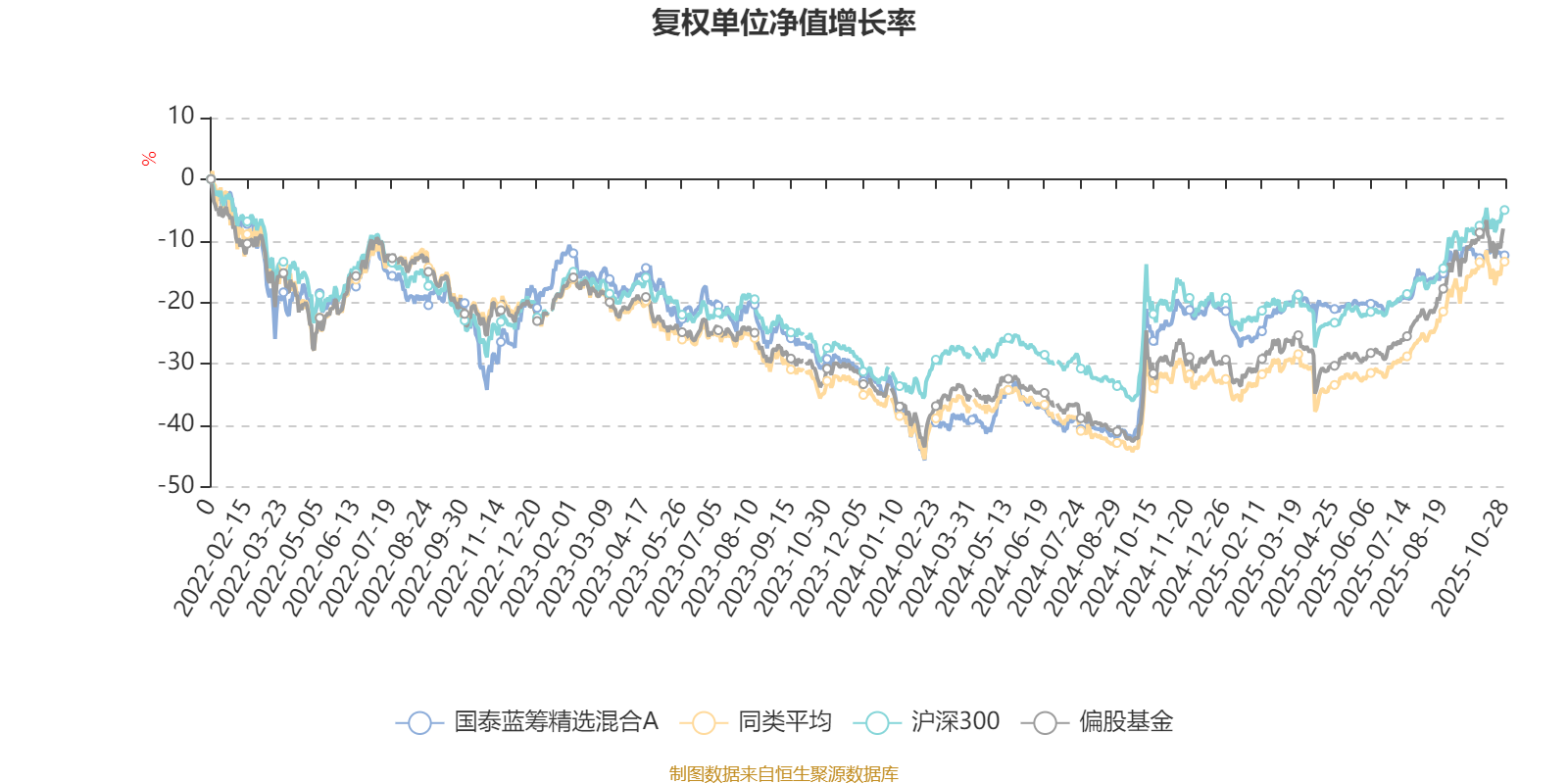 截至10月28日,国泰蓝筹精选混合A近三个月复权单位净值增长率为3.75%,位于同类可比基金164/185;近半年复权单位净值增长率为11.10%,位于同类可比基金168/185;近一年复权单位净值增长率为13.67%,位于同类可比基金148/181;近三年复权单位净值增长率为30.54%,位于同类可比基金61/175。