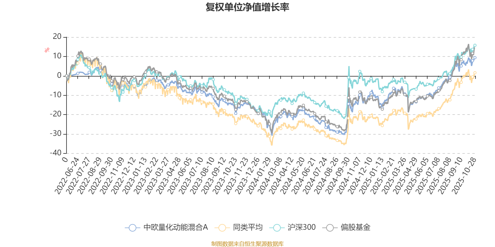 截至10月28日,中欧量化动能混合A近三个月复权单位净值增长率为11.54%,位于同类可比基金378/621;近半年复权单位净值增长率为26.40%,位于同类可比基金354/619;近一年复权单位净值增长率为25.59%,位于同类可比基金332/611;近三年复权单位净值增长率为19.17%,位于同类可比基金247/518。