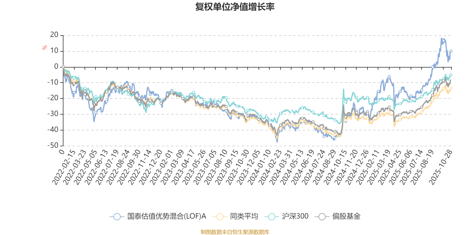 截至10月28日,国泰估值优势混合(LOF)A近三个月复权单位净值增长率为22.52%,位于同类可比基金44/185;近半年复权单位净值增长率为31.27%,位于同类可比基金82/185;近一年复权单位净值增长率为57.70%,位于同类可比基金12/181;近三年复权单位净值增长率为39.40%,位于同类可比基金42/175。