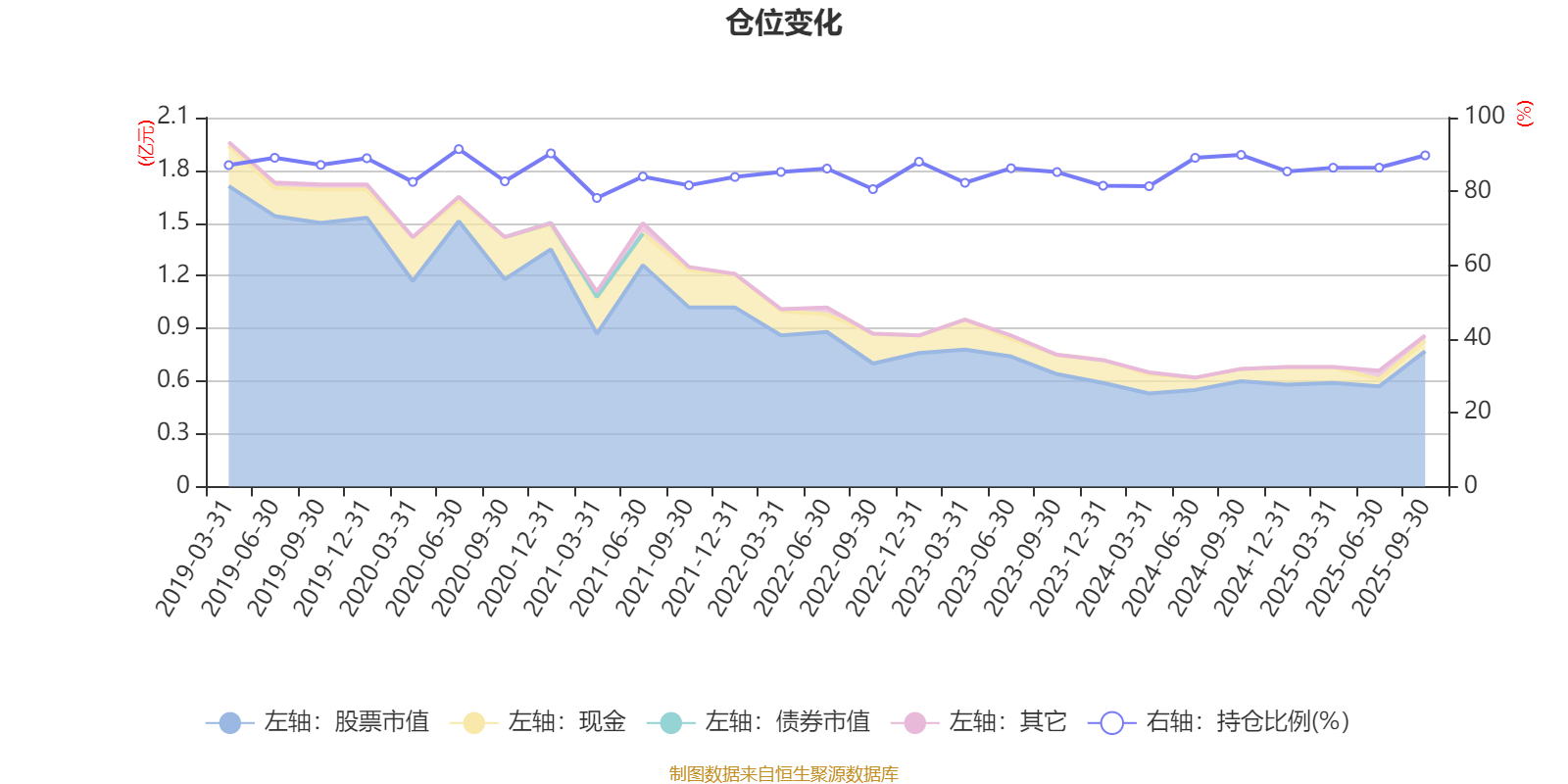 据定期报告数据统计,近三年平均股票仓位为85.99%,同类平均为83.73%。2020年上半年末基金达到91.46%的最高仓位,2021年一季度末最低,为78.23%。