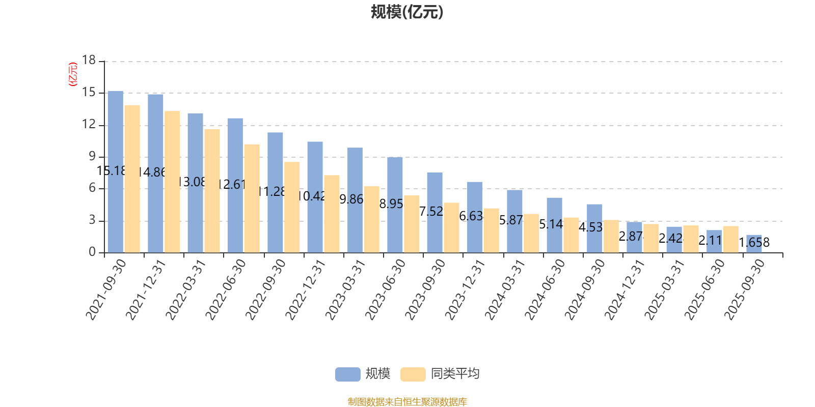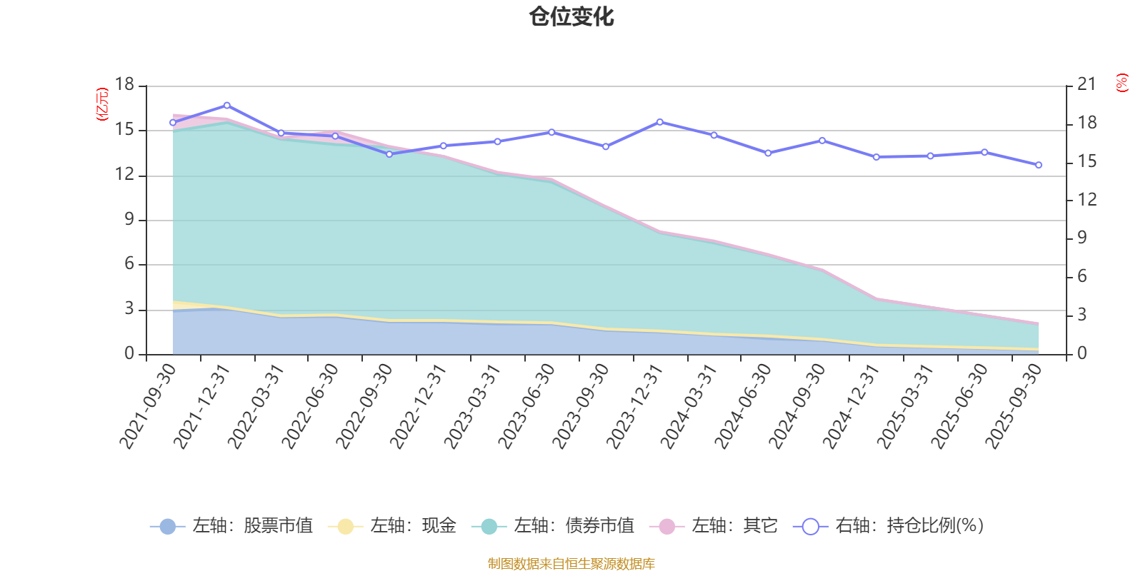 据定期报告数据统计,近三年平均股票仓位为16.32%,同类平均为19.13%。2021年末基金达到19.46%的最高仓位,2025年三季度末最低,为14.8%。