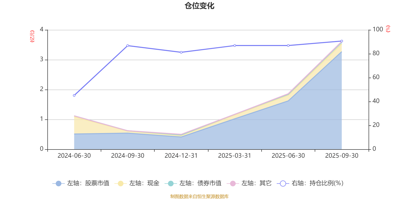 据定期报告数据统计,成立以来平均股票仓位为79.57%,同类平均为85.66%。2025年三季度末基金达到90.62%的最高仓位,2024年上半年末最低,为45.07%。