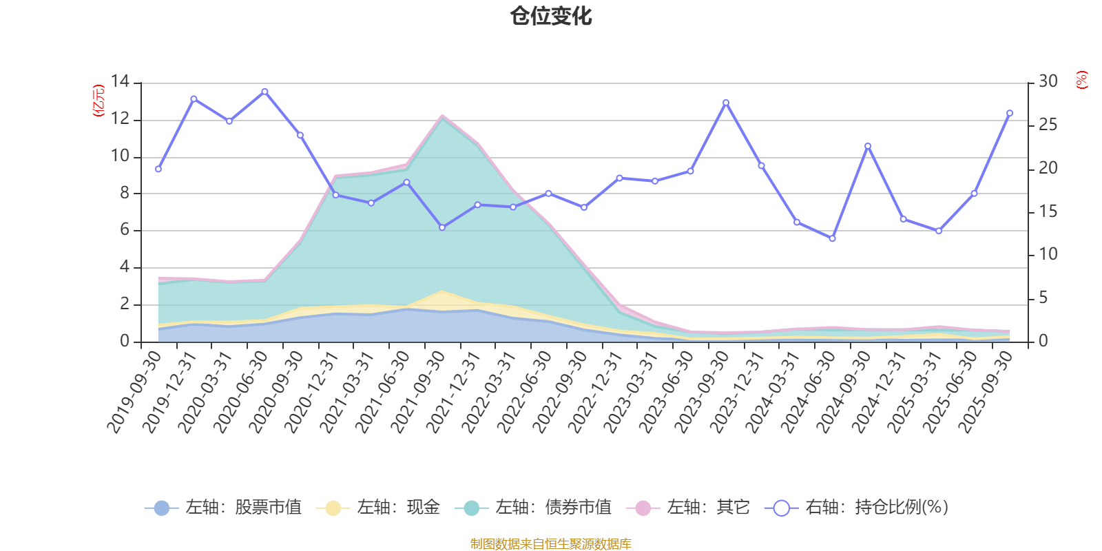 据定期报告数据统计,近三年平均股票仓位为18.72%,同类平均为72.35%。2020年上半年末基金达到28.97%的最高仓位,2024年上半年末最低,为11.98%。