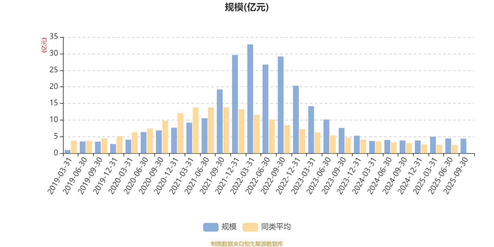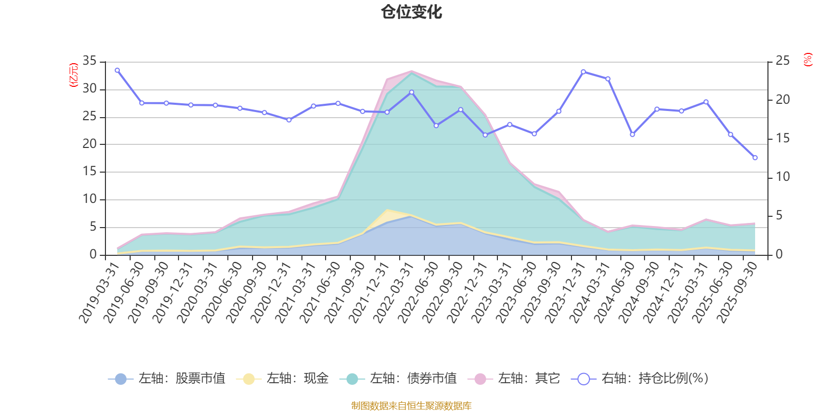 据定期报告数据统计,近三年平均股票仓位为17.85%,同类平均为19.14%。2019年一季度末基金达到23.89%的最高仓位,2025年三季度末最低,为12.59%。