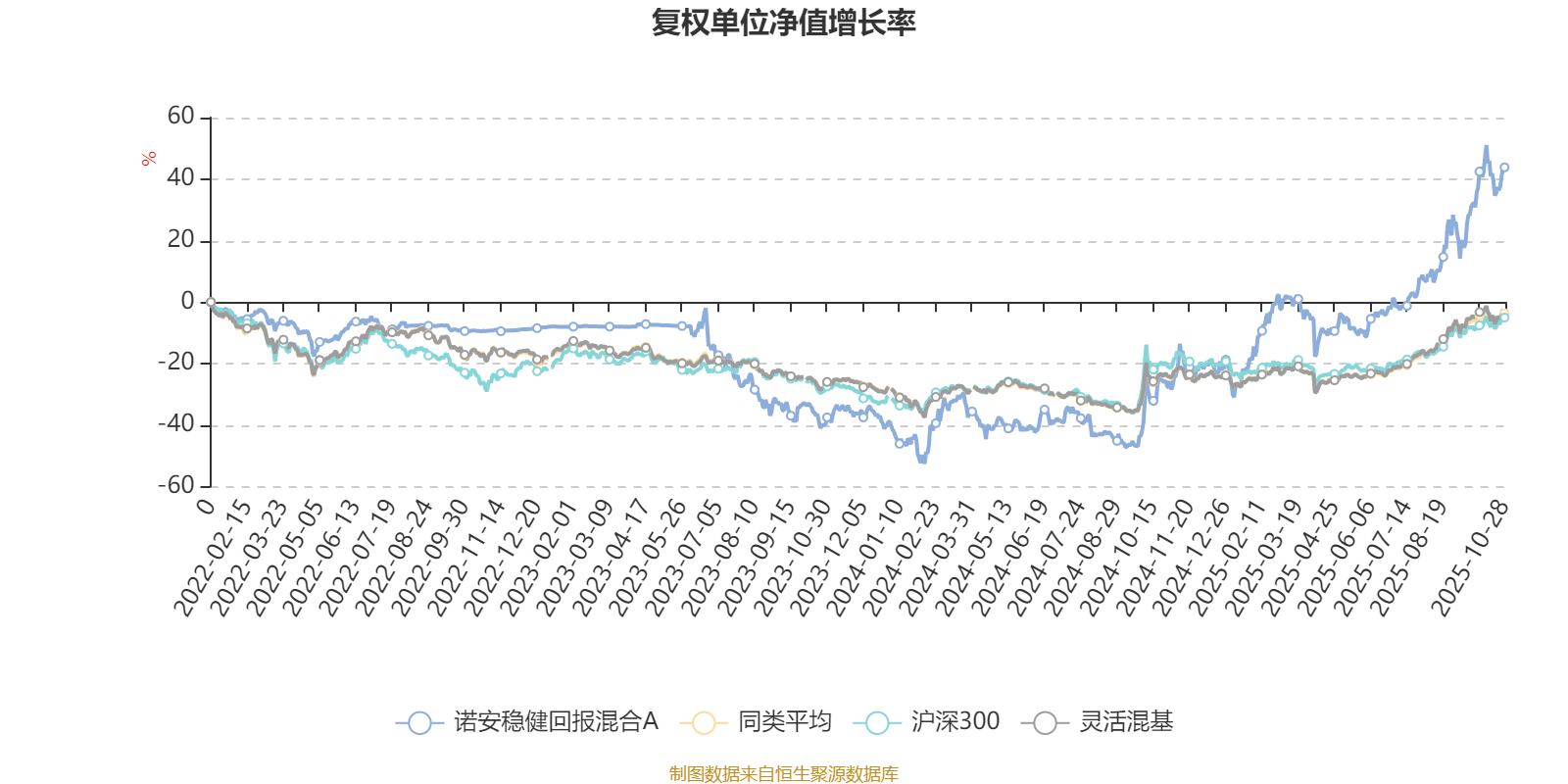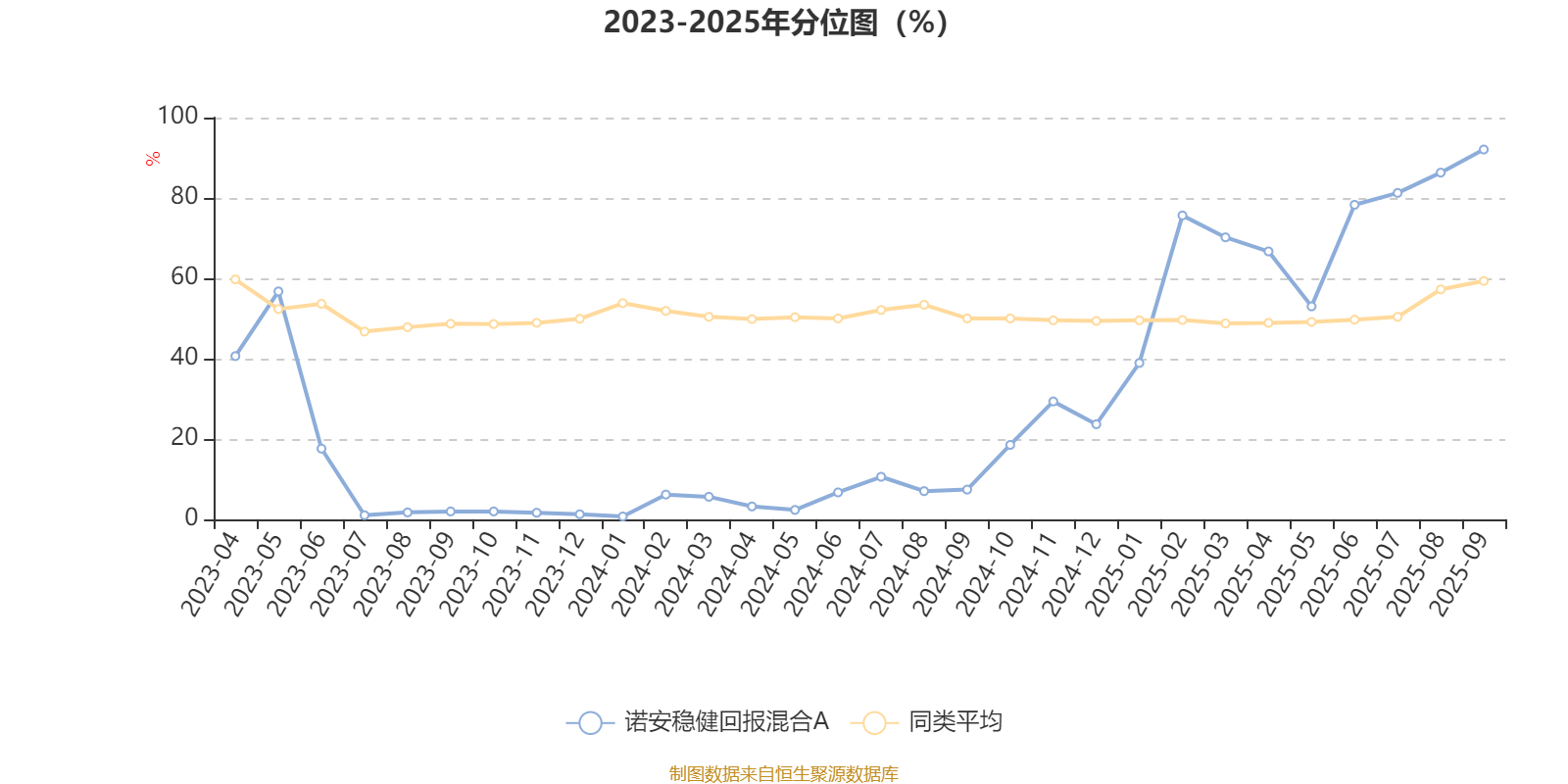 截至10月28日,诺安稳健回报混合A近三个月复权单位净值增长率为33.78%,位于同类可比基金132/1287;近半年复权单位净值增长率为59.99%,位于同类可比基金102/1287;近一年复权单位净值增长率为93.48%,位于同类可比基金16/1287;近三年复权单位净值增长率为58.90%,位于同类可比基金106/1286。