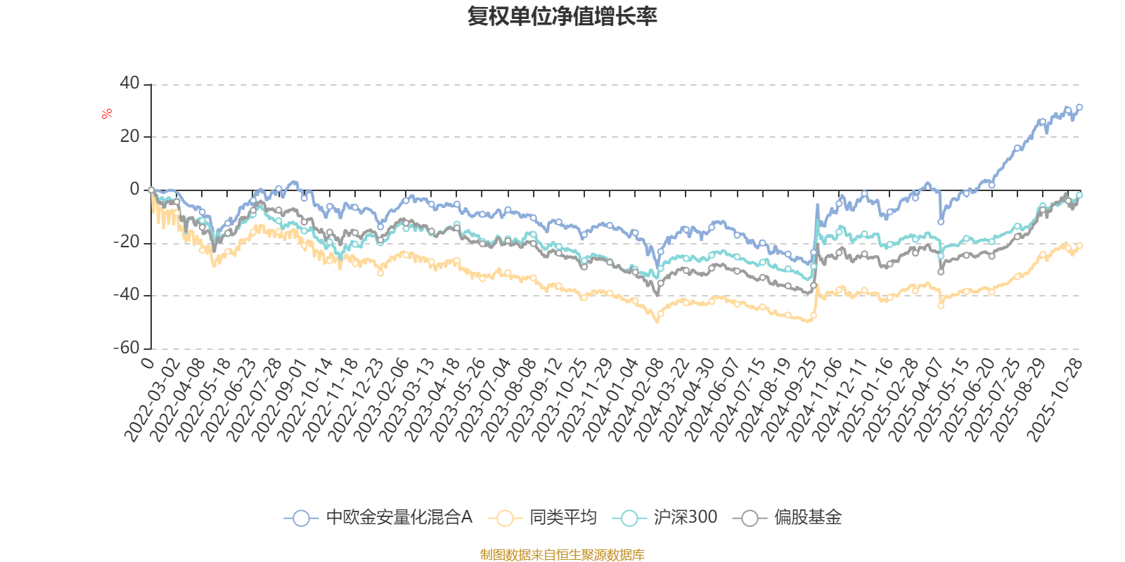 截至10月28日,中欧金安量化混合A近三个月复权单位净值增长率为12.82%,位于同类可比基金339/621;近半年复权单位净值增长率为36.60%,位于同类可比基金192/619;近一年复权单位净值增长率为40.64%,位于同类可比基金162/611;近三年复权单位净值增长率为46.56%,位于同类可比基金93/518。