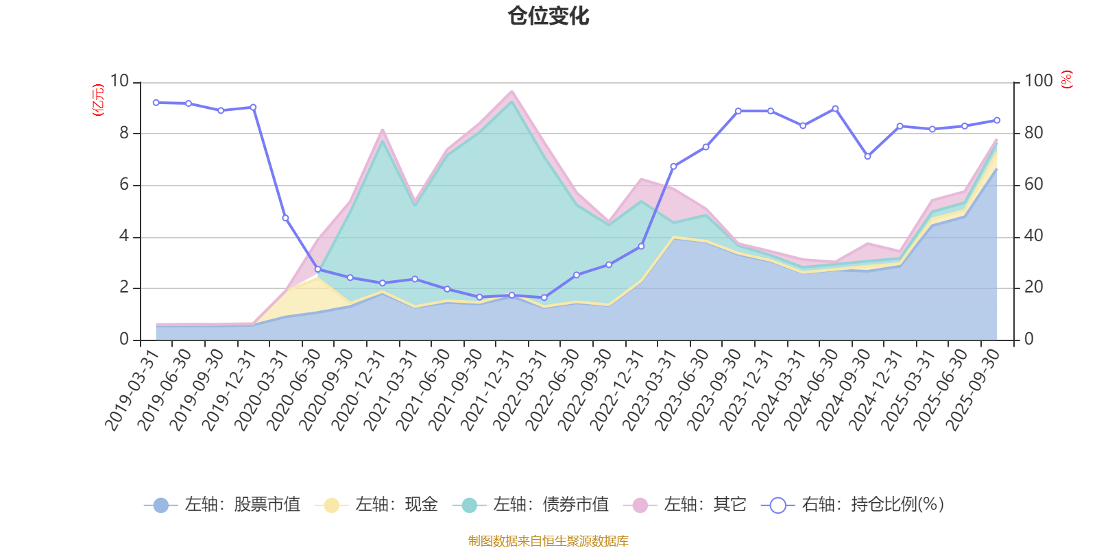 据定期报告数据统计,近三年平均股票仓位为77.79%,同类平均为72.35%。2019年一季度末基金达到92.09%的最高仓位,2022年一季度末最低,为16.49%。