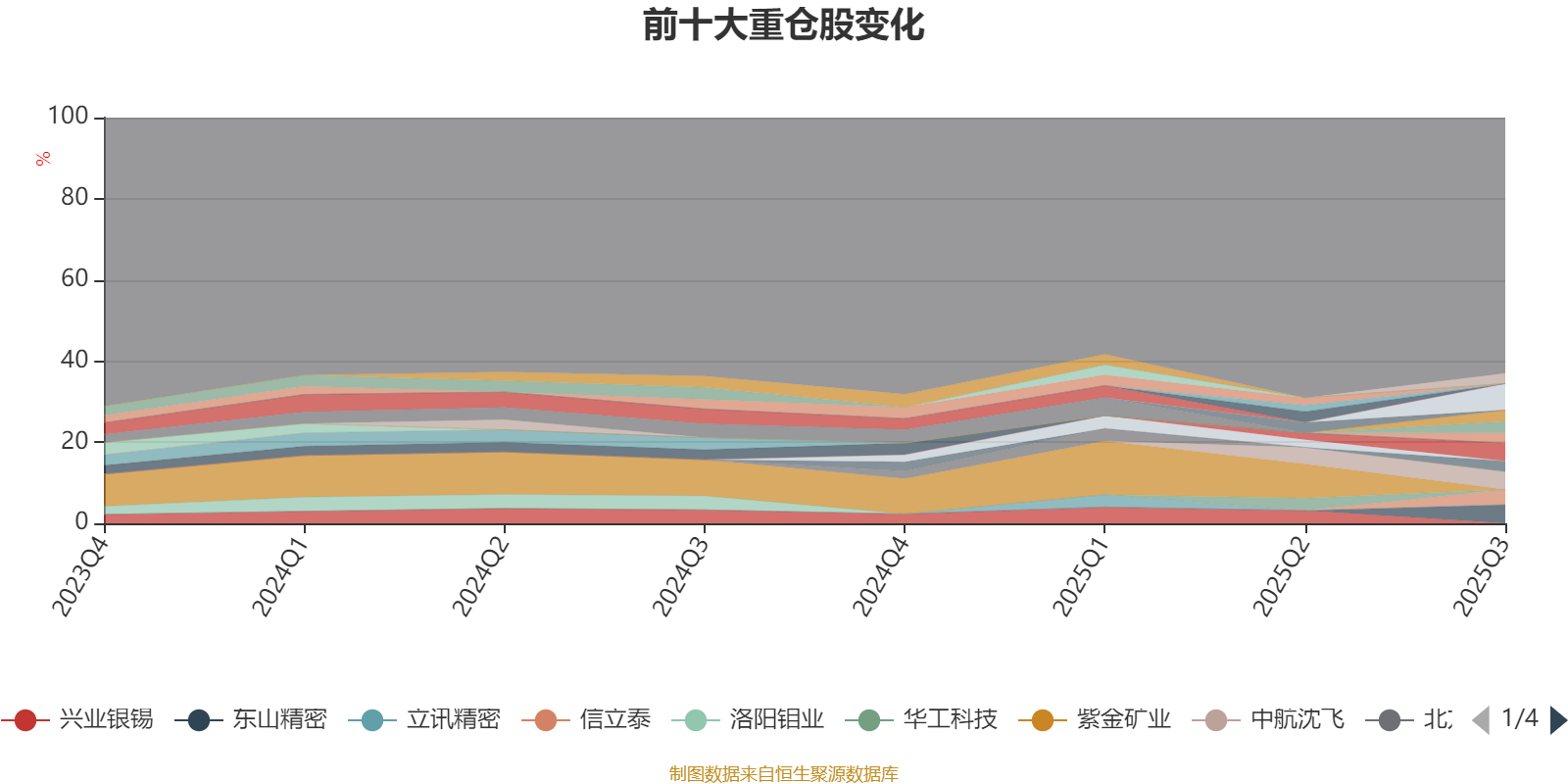 截至2025年三季度末,基金十大重仓股分别是亿纬锂能、东山精密、中航沈飞、盛达资源、信立泰、寒武纪、恒玄科技、宁德时代、兆易创新、海力风电。