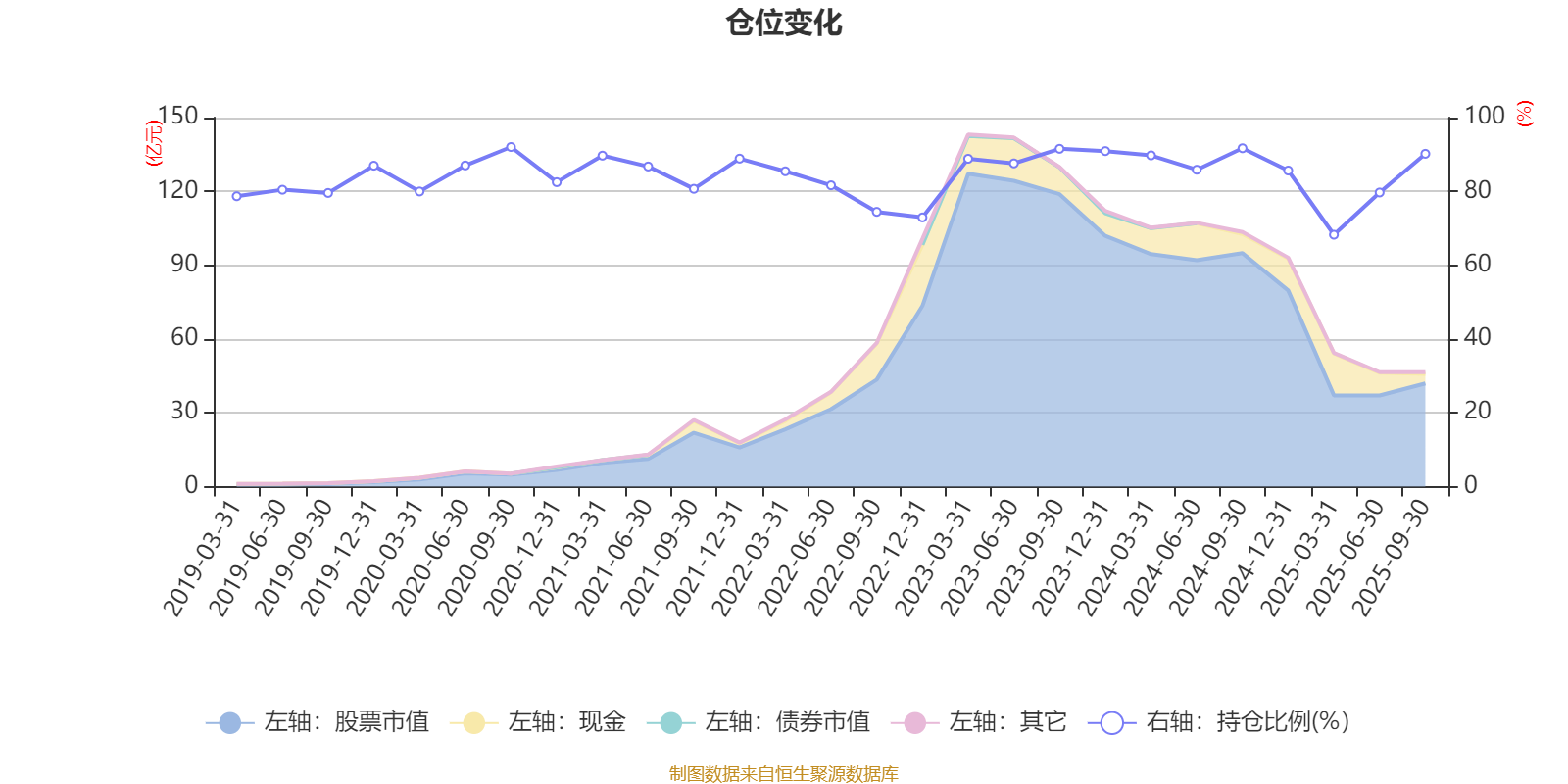 据定期报告数据统计,近三年平均股票仓位为85.25%,同类平均为72.35%。2020年三季度末基金达到92.03%的最高仓位,2025年一季度末最低,为68.26%。