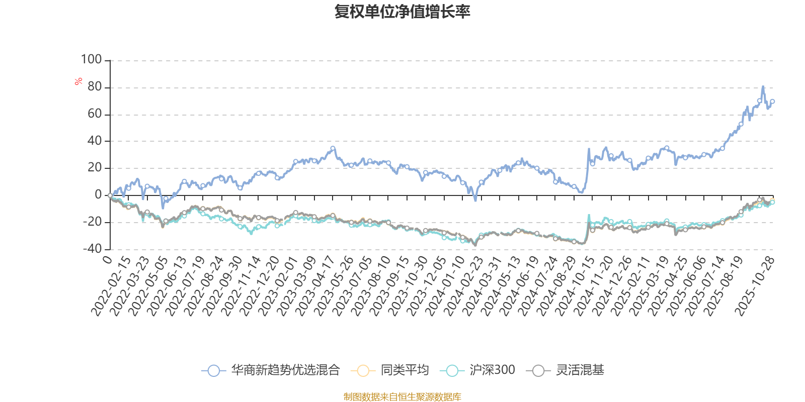截至10月28日,华商新趋势优选混合近三个月复权单位净值增长率为18.06%,位于同类可比基金409/1287;近半年复权单位净值增长率为33.25%,位于同类可比基金412/1287;近一年复权单位净值增长率为31.60%,位于同类可比基金381/1287;近三年复权单位净值增长率为54.30%,位于同类可比基金135/1286。